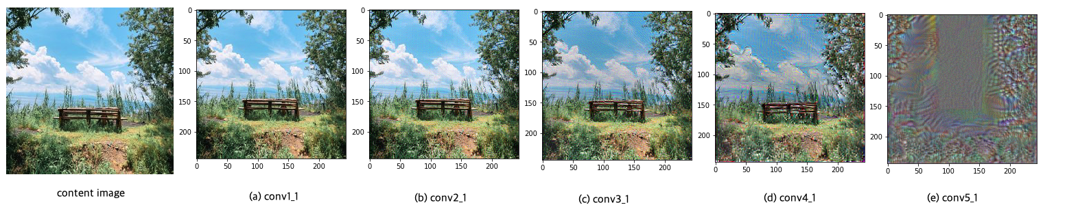 논문의 Figure 1에서 Content Reconstruction을 다음과 같이 재연하였다. 층이 깊어질수록 원본보다 거칠게 보이는 것을 확인할 수 있다. 논문과 상이한 것은, (e) conv5_1에서는 이미지가 완전히 뭉게진다는 점이다. 그림의 특성인지 구현의 오류인지는 확인하지 않았다. 이제 스타일을 학습하는 방법을 소개한다.