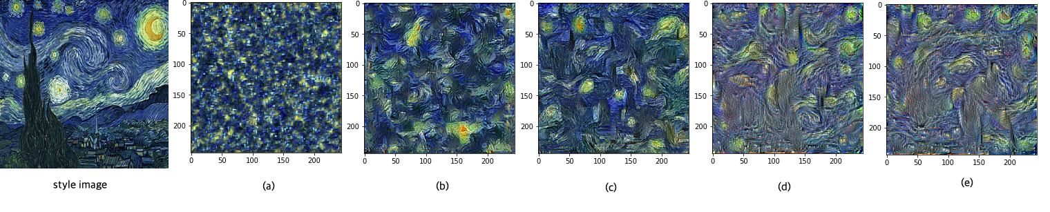 논문의 Figure 1에서 Style reconstruction을 다음과 같이 재연하였다. 논문의 figure와는 특히 (d)와 (e)에서 다른 모습을 보인다.